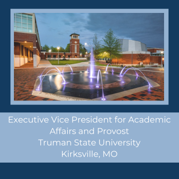 Truman State University—Missouri’s only public liberal arts and sciences university—seeks a strategic, collaborative, and innovative academic leader to serve as its next Executive Vice President for Academic Affairs and Provost (EVPAA). The University desires a leader who combines passion, energy, and a positive attitude, with a strong commitment to students and sustained excellence. As a member of the Executive Leadership Team, the Provost will articulate the academic vision and direction of the University and is responsible for all elements of Truman’s academic mission.